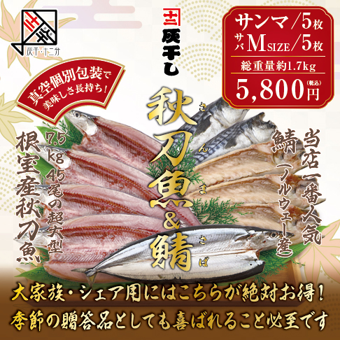 【根室産サンマ 5枚・サバM5枚 計10枚セット】灰干し・十二分 ツイートする シェアする 販売価格: 5,800円(税込み) 会員価格 (税込み) 通常価格 (税込み) 在庫 10 商品コード SANMA5-SABA-M5-10 JANコード 数量 1 2 3 4 カートに入れる